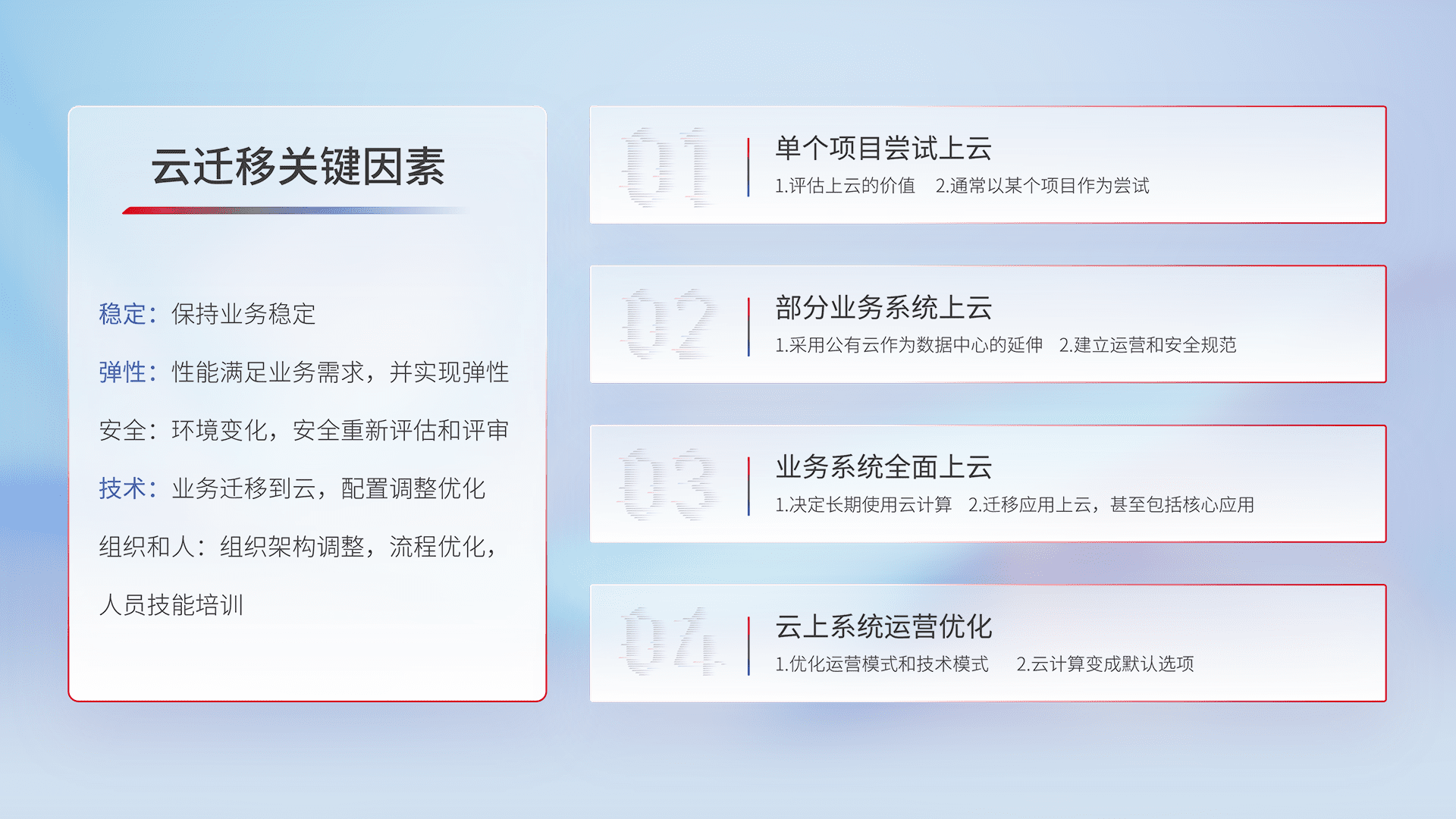 结合实际业务,,,,从规划设计、、、云平台选型、、云原生改造、、、、数据迁移、、集成交付,,,迁移全过程为客户识别最佳上云路径,,,做好风险识别管理,,,,设计网络架构、、身份权限、、、、安全审计合规、、操作审计、、、日志审计、、、监控告警策略、、、多站点容灾设计等,,,,对云上基础设施进行整体规划,,提升IT治理水平,,,以满足弹性、、、高可用、、高性能的需求。。。。