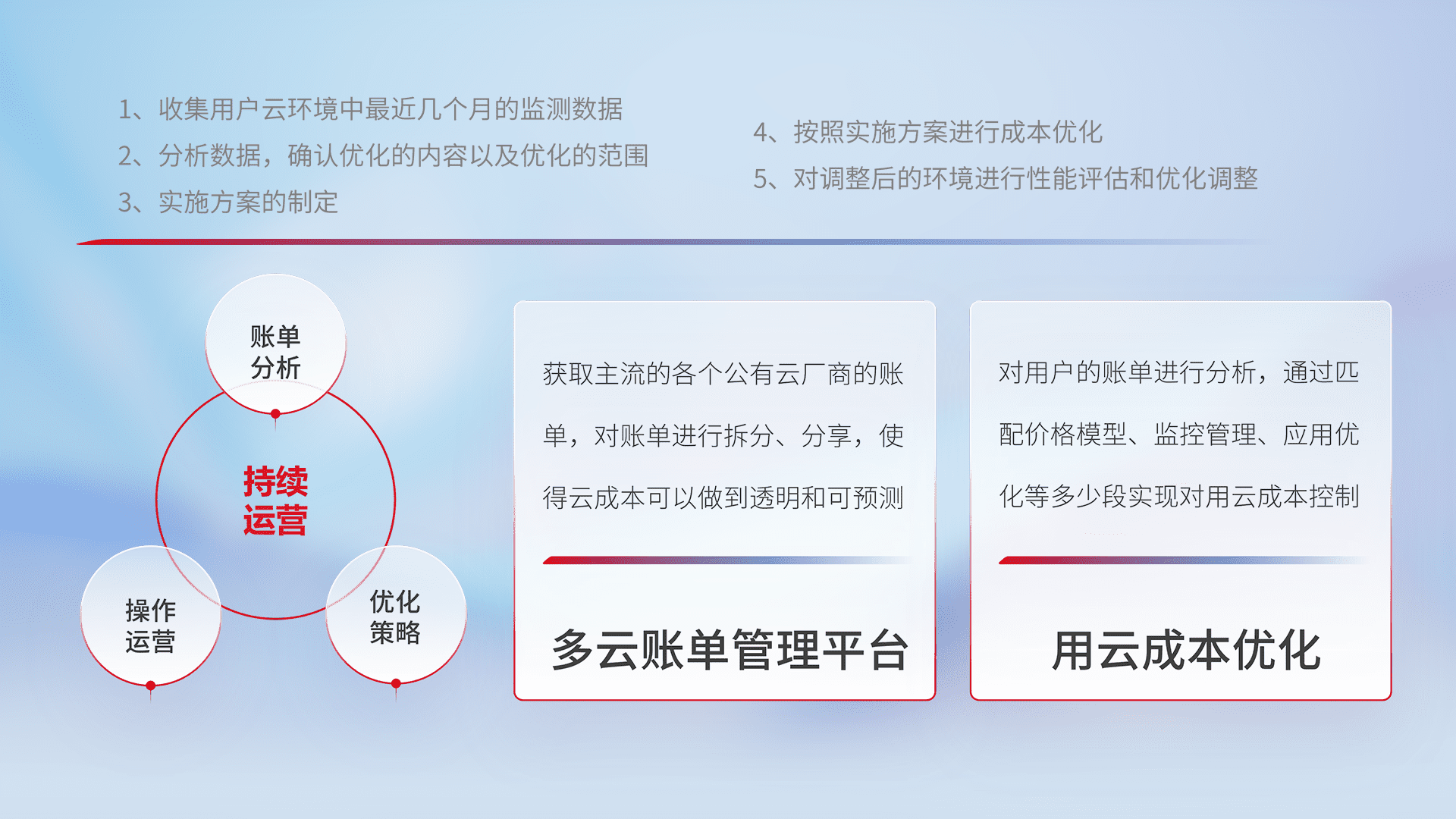 通过多云纳管,,,以统一的资源数据模型把客户的云资源进行抽象和封装,,,,进而实现对多云资源的统一操作,,保障云资源管理的可靠性、、、稳定性与可用性。。。量身定制化运维内容,,,,配置、、、、开发运维、、补丁管理、、、、备份、、、、监控、、认证和访问管理、、审计和日常巡检等,,,保障在用云过程中的可靠度,,稳定度以及高可用率。。